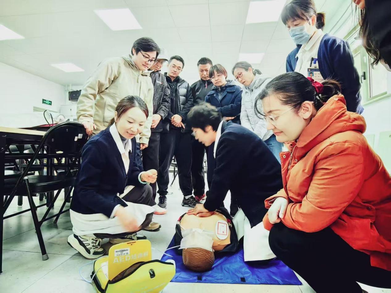 在实操环节,医护人员现场进行了标准化的操作示范,详细演示了心肺复苏按压技巧、人工呼吸要领以及AED除颤仪的规范使用方法。参训教师在医护人员的专业指导下,逐一进行实操演练。医护人员对每位教师的操作进行细致点评,及时纠正动作偏差,确保每位参训者都能熟练掌握规范的急救操作技能。