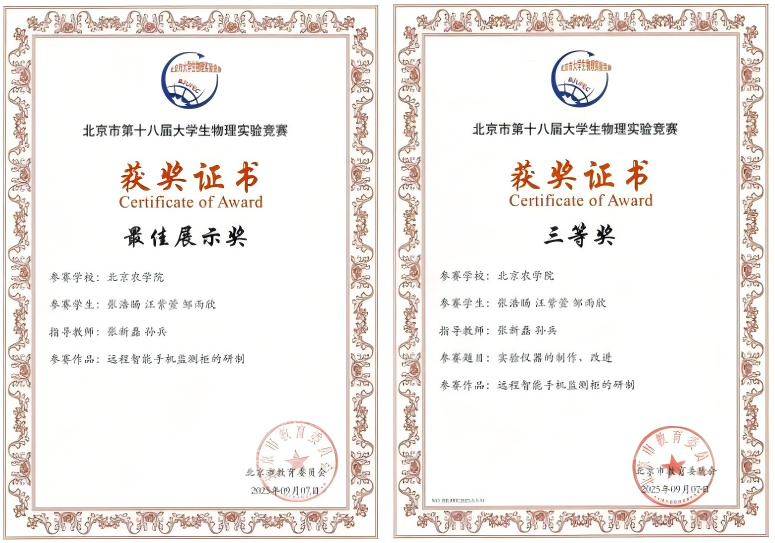 北京市大学生物理实验竞赛由北京市教育委员会主办,是我校基础教学部物理教研室持续组织学生参与的重点学科竞赛之一。在本次比赛中,我校参赛队伍凭借新颖的创意、完整的作品功能以及出色的现场展示,获得了评委专家的充分肯定。