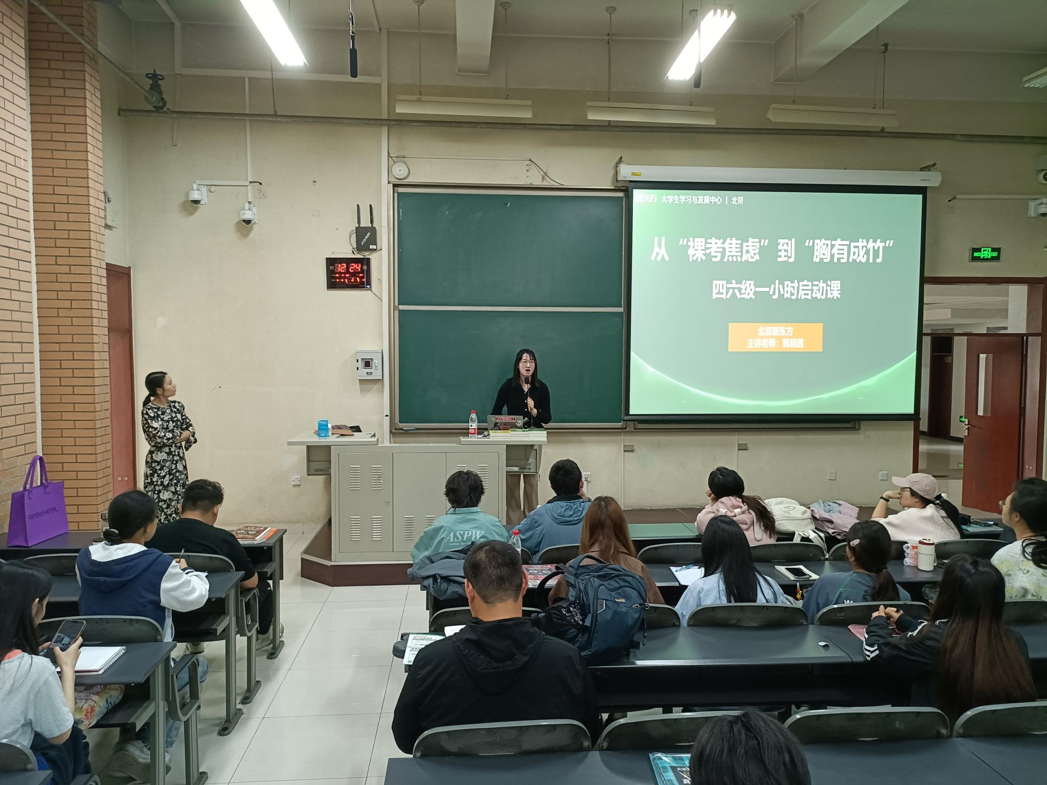 韩晓茜老师精准把握四六级英语阅读的核心难点,系统地讲解了高分应试策略。她针对阅读重点题型,传授逻辑清晰、高效实用的解题技巧和备考方法,为同学们明确了备考方向。韩老师运用风趣的语言、生动的案例,逐一剖析备考难点,并通过互动提问引导大家积极思考。现场气氛十分热烈,同学们在轻松愉悦的氛围中掌握了四六级阅读的解题 “金钥匙”,备考信心大幅增强。
