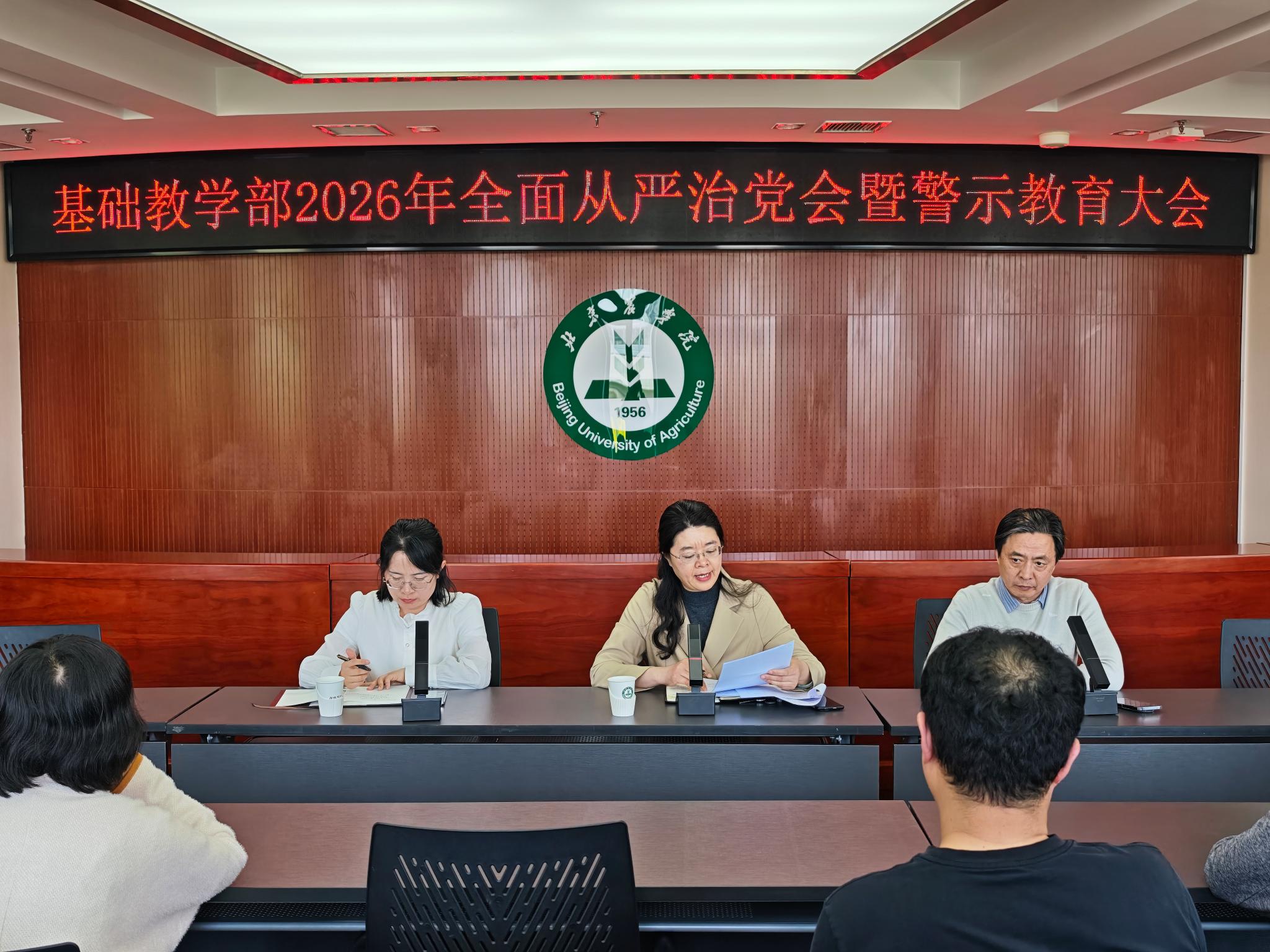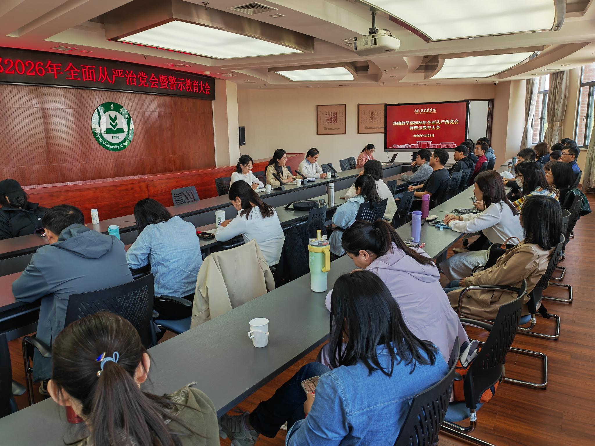 4月21日中午,基础教学部召开全体教师大会,传达学习学校2026年全面从严治党工作会暨警示教育大会精神,深化以案促改,推进全面从严治党向纵深发展。会议由党总支书记牟玉荣主持。