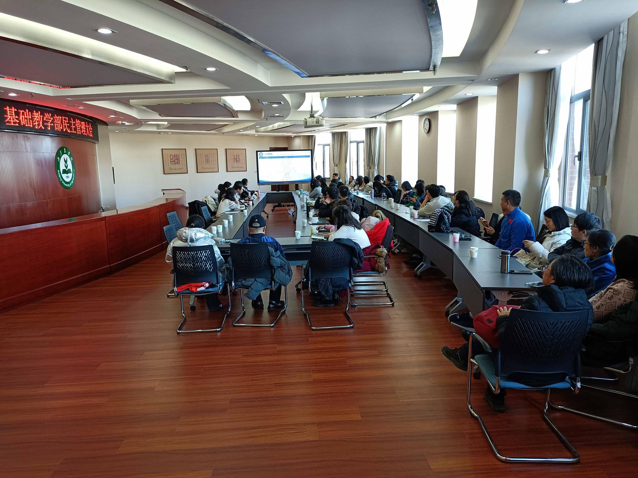 为深入贯彻落实学校第四次党代会精神,加强民主管理,增强凝聚力,2026年1月21日中午,基础教学部分工会在图书馆303会议室召开民主管理大会。大会以“深化民主管理、凝聚育人合力、共促高质量发展”为主题。基础教学部全体教职工参会,分工会主席吴宝利主持会议。
