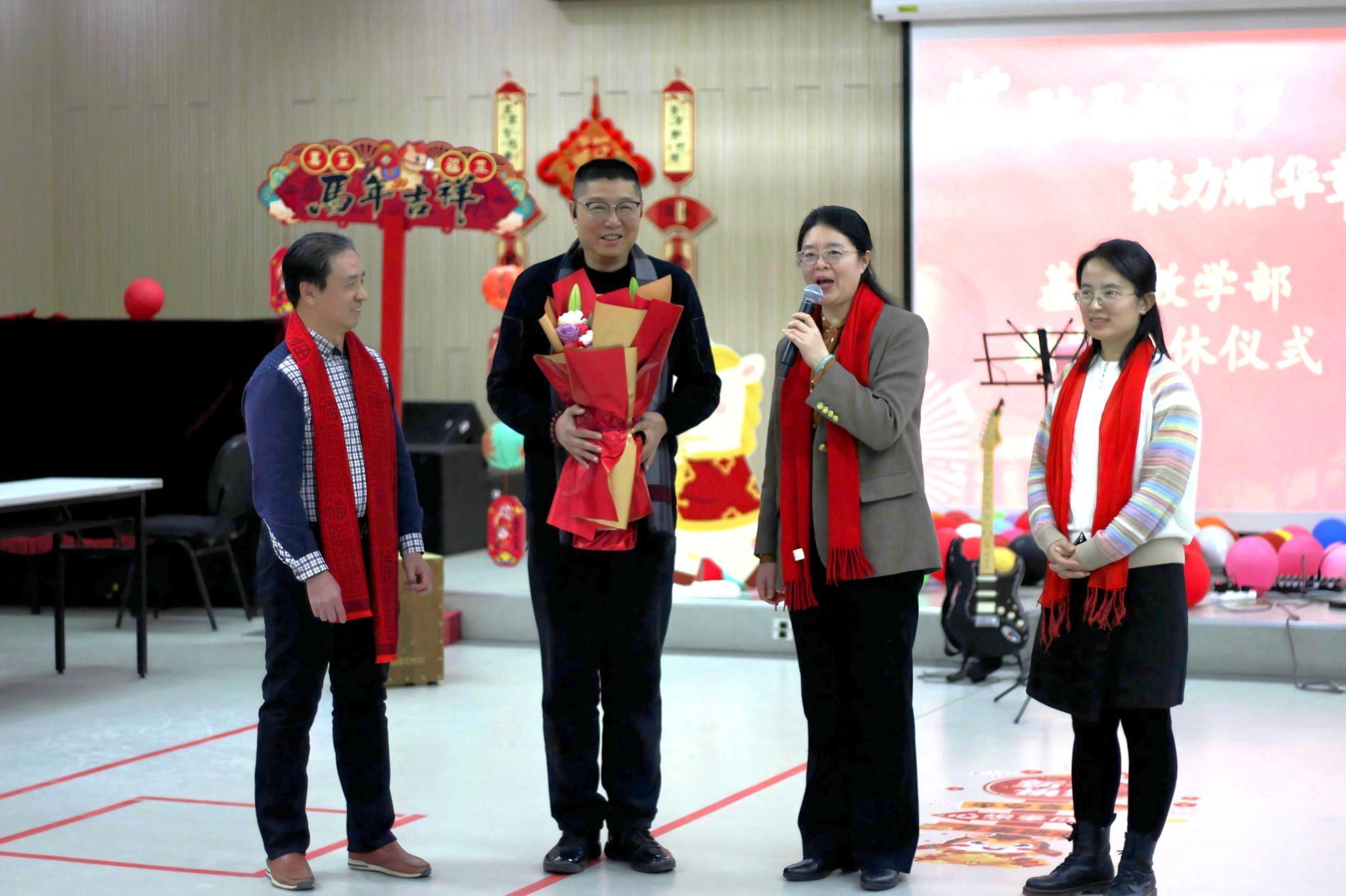 联欢会伊始,举行了荣休仪式。党总支书记牟玉荣、主任杨为民为勾占宁教授献花,感谢他为体育育人、青年教师成长及体育教学部发展作出的积极贡献,祝愿勾教师生活幸福、安康顺遂。