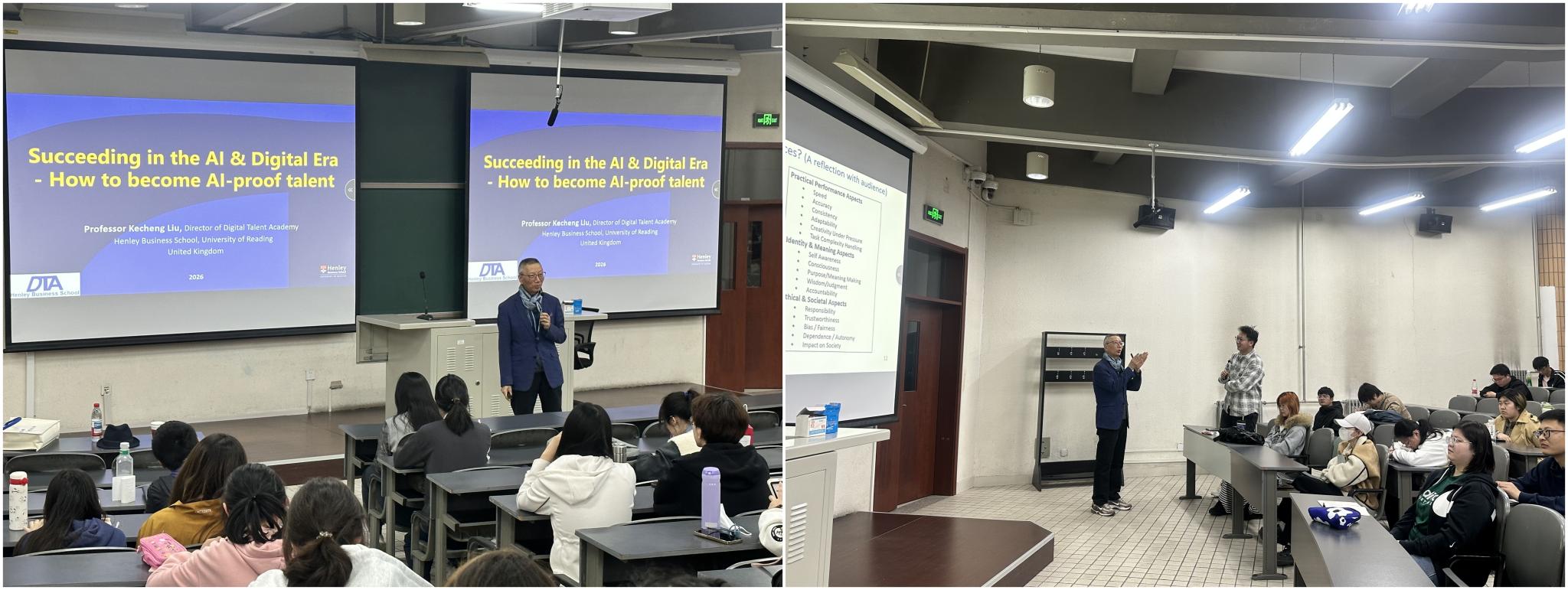 4月14日晚,基础教学部举办数字人才成长专题学术讲座,特邀英国雷丁大学亨利商学院数字人才学院院长刘科成教授作了题为《如何在人工智能和数字时代取得成功?如何成为AI-Proof人才》的讲座,助力学子把握AI发展趋势,筑牢核心竞争力。基础教学部主任杨为民主持讲座。