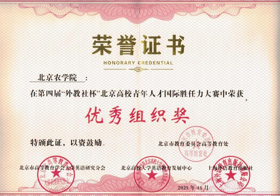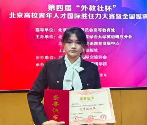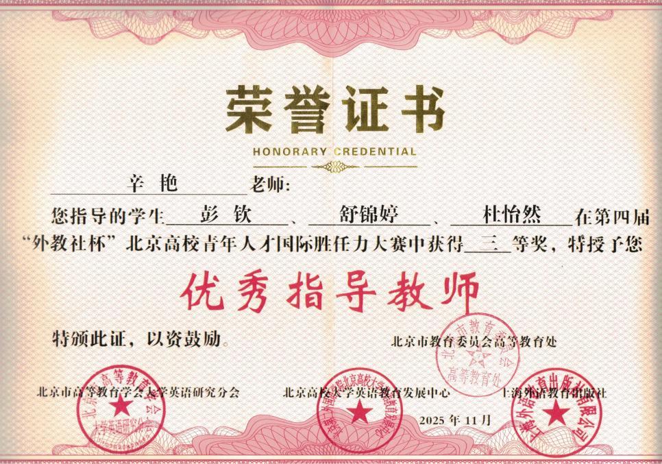 近日,第四届“外教社杯”北京高校青年人才国际胜任力大赛在中国人民大学圆满落幕。我校代表队凭借扎实的专业功底、出色的外语表达和创新的实践提案脱颖而出,斩获大赛三等奖,学校获评“优秀组织奖”,外语教学部辛艳老师荣获 “优秀指导教师奖”。
