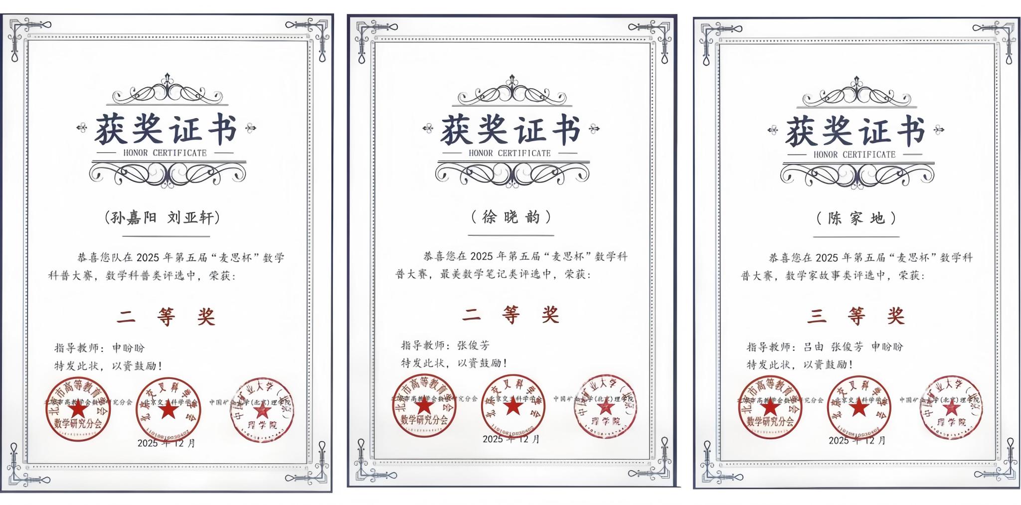 近日,由北京市高等教育学会数学研究分会联合北京交叉科学学会主办的第五届“麦思杯”数学科普大赛获奖结果正式揭晓。该赛事以激发数学兴趣、推广数学知识为核心,面向全社会征集数学思政案例、行业应用案例等八类主题作品。基础教学部数学教研室积极组织学生参赛,凭借扎实的作品质量与创新的呈现形式脱颖而出,共斩获二等奖4项、三等奖1项的优异成绩。